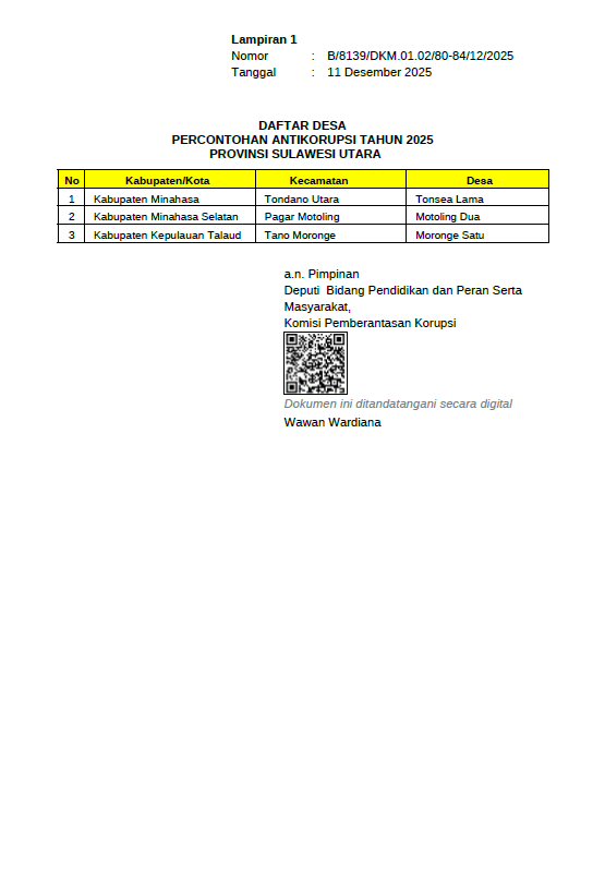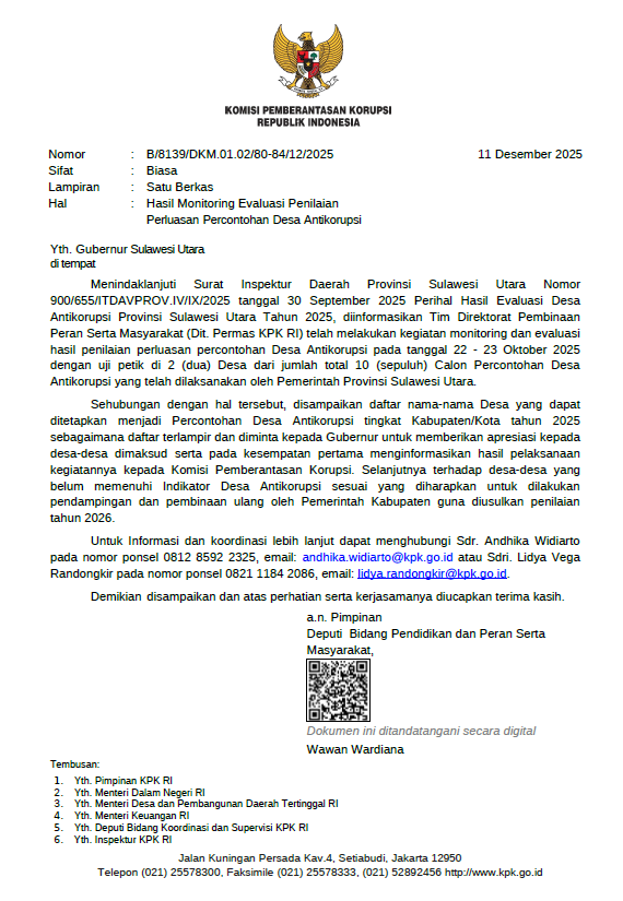 Keputusan ini, menyusul keluarnya Surat KPK RI Nomor : B/8139/DKM.01.02/80-84/12/2025 tangga 11 Desember 2025 perihal : Hasil Monitoring dan Evaluasi Penilaian Perluasan Percontohan Desa Antikorupsi, yang ditanda-tangani secara elektronik oleh Wawan Wardiana, Deputi Bidang Pendidikan dan Peran Serta Masyarakat KPK RI.